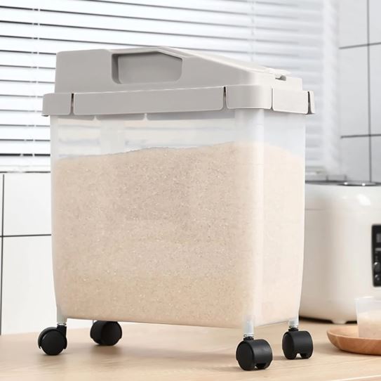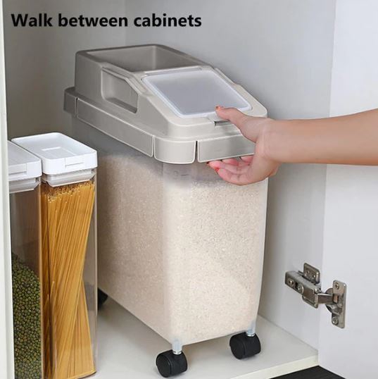 - Our rice container with four caster wheels on the bottom, the wheels can rotate in 360 degrees, saving time and effort. There is a lifting design on the lid, it is also very convenient to carry.