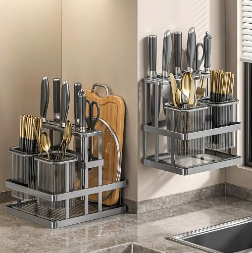 1Pc Metal Kitchen Knife Rack with Chopstick Cage, Wall Mounted Countertop Organizer for Cutlery, Chopping Board Storage Holder