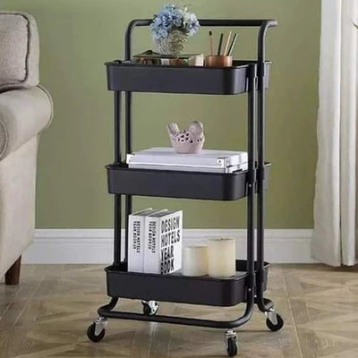 - The 3 Tier Metal Trolley is a durable and sleek storage solution for organizing items in your home or workplace. With three spacious tiers, it offers ample storage space for various items.