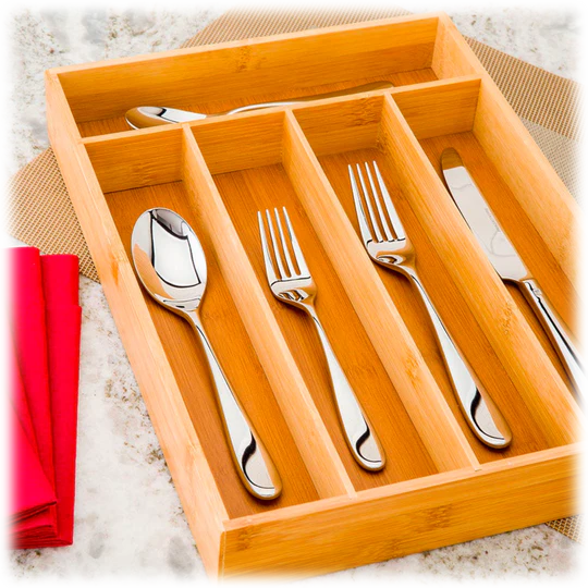 - This bamboo cutlery tray is a kitchen accessory used for organizing and storing cutlery, such as knives, forks, and spoons.