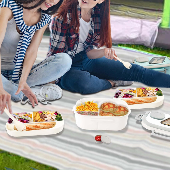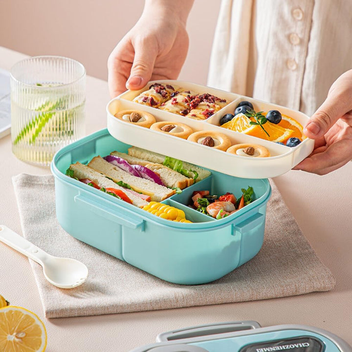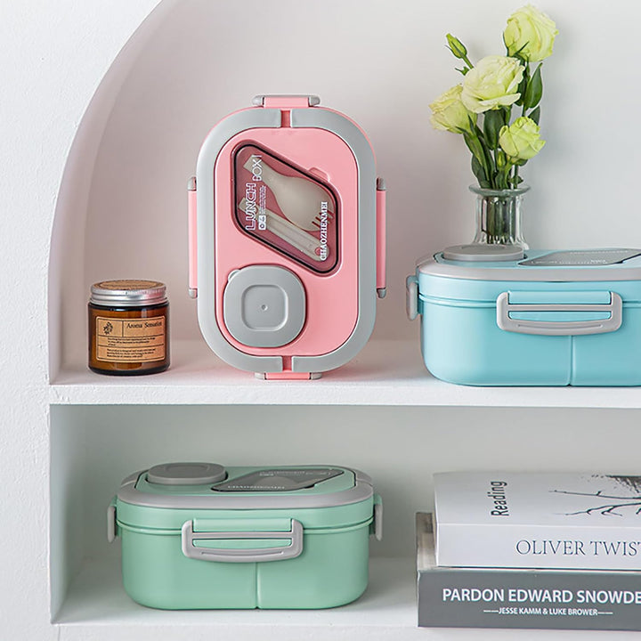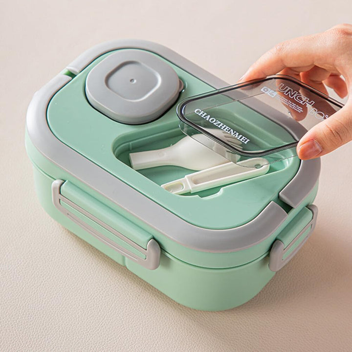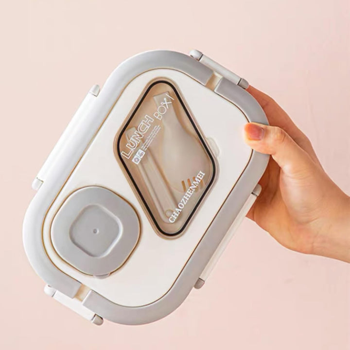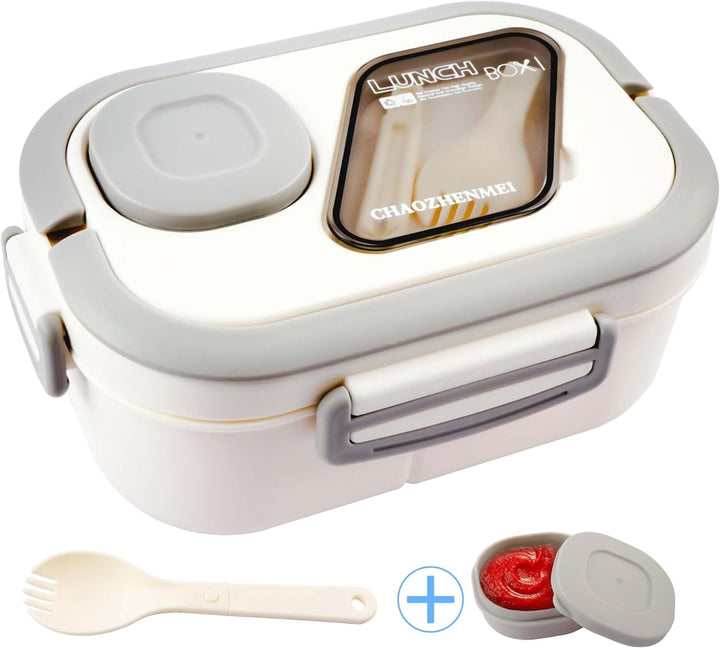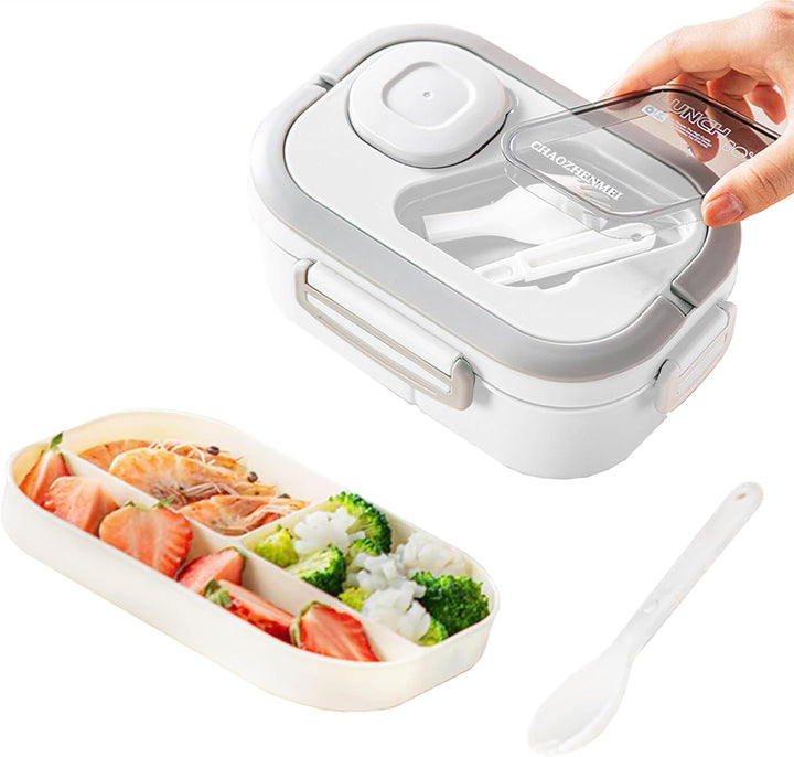 - Bento box compartment lunch box with reusable cutlery and forks in one piece. With the fork slot cover to store the spoons, which is convenient to carry.