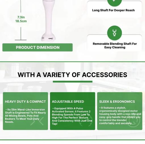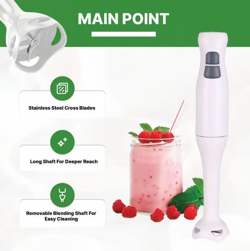 - Its stainless steel cross blades ensure efficient ice crushing and precision blending, while the long shaft reaches deeper into containers, providing a smooth blending experience.