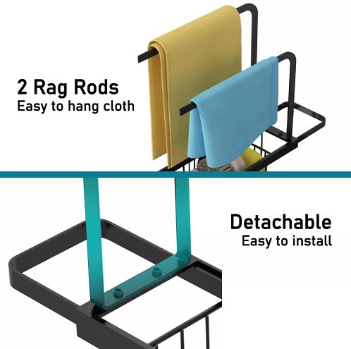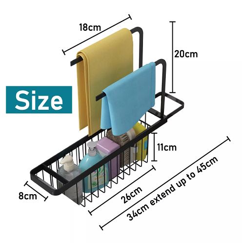 - 【Multifunctional】 2 in 1 design of telescopic sponge organizer holder with 2 towel bar ,easy to store cleaning utensils, such as dish washing liquid, hand sanitize, brush, dishcloth, etc. Drain Basket Rack is comfortable to handle at an appropriate height, and convenient for daily cleaning.