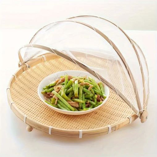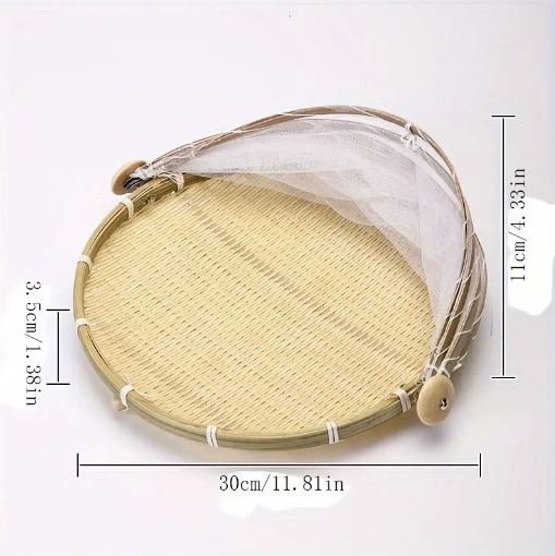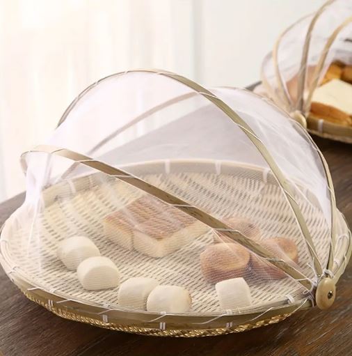 Handcrafted Bamboo Food Basket With Cover - Foldable, Fly & Mosquito Proof Mesh Cover Basket, Perfect for Fruits, Vegetables, Bread Storage