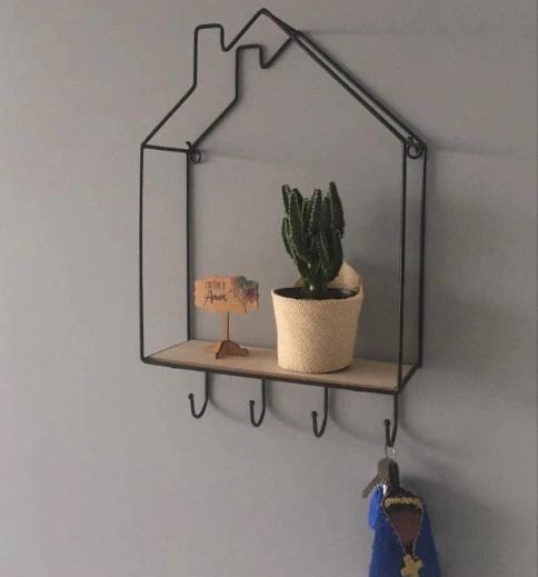 - This wall shelf is designed to resemble a hut or a small house, adding a charming and rustic touch to any room.
