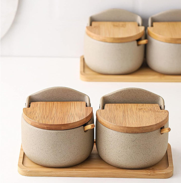 Japanese Style Ceramic Spice Jars, Seasoning Jar Combination Set With 2 Wooden Spoons, Lid & Tray