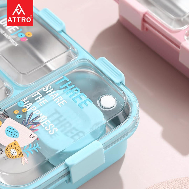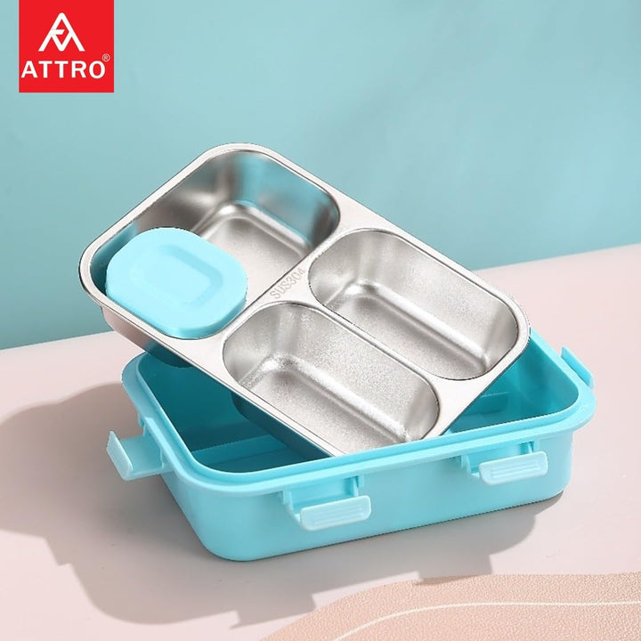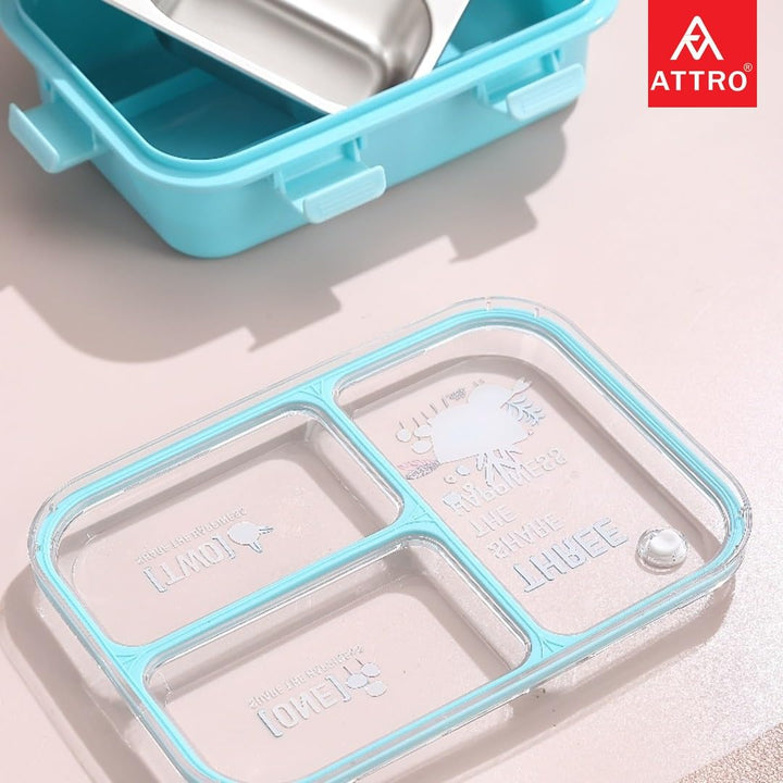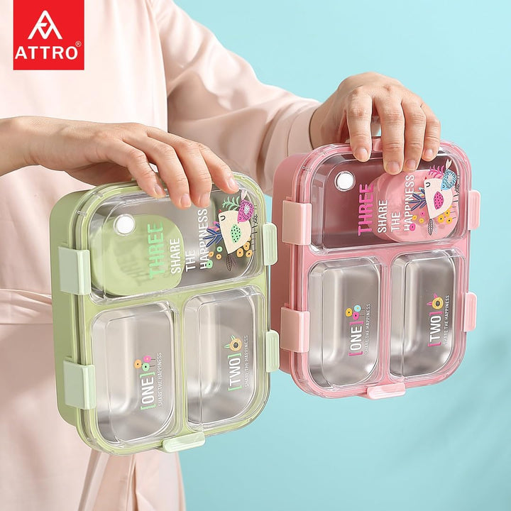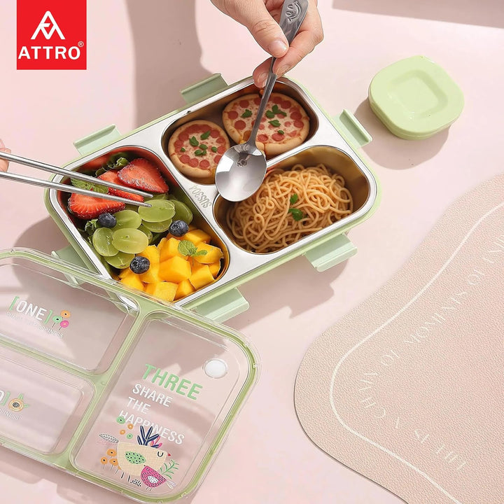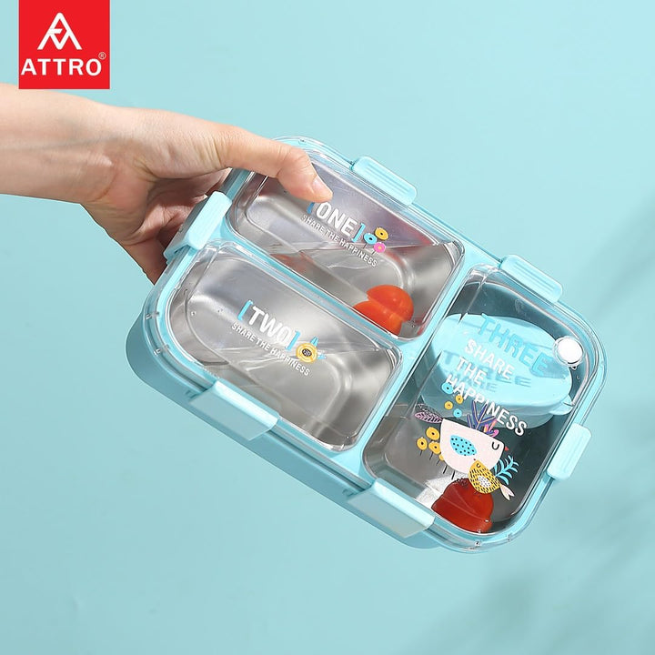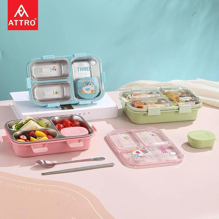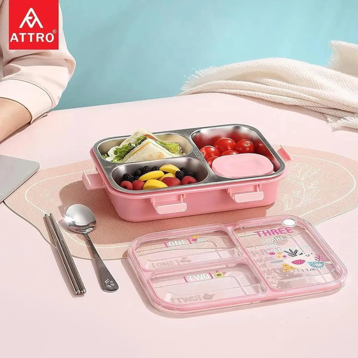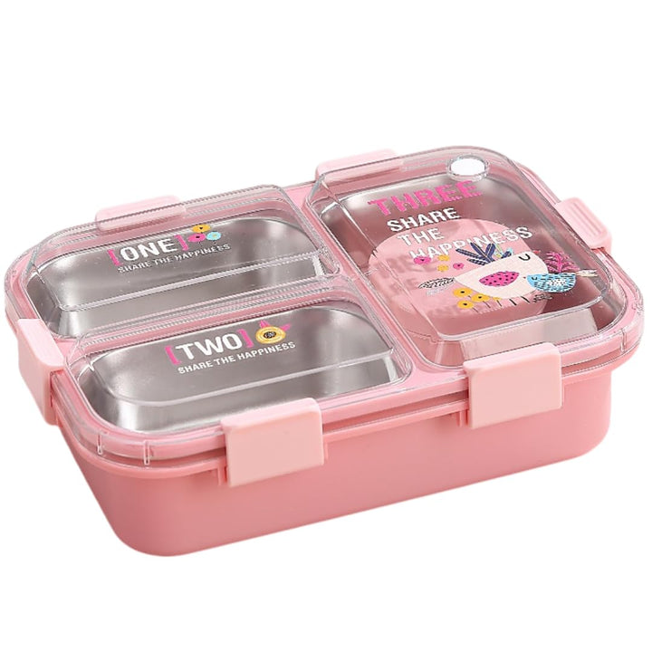 Kids Lunch Box with 3 Compartment Inner Steel, 1 Small Container, Spoon & Chopstick Air-Tight Leakproof Heat Water Insulation Design