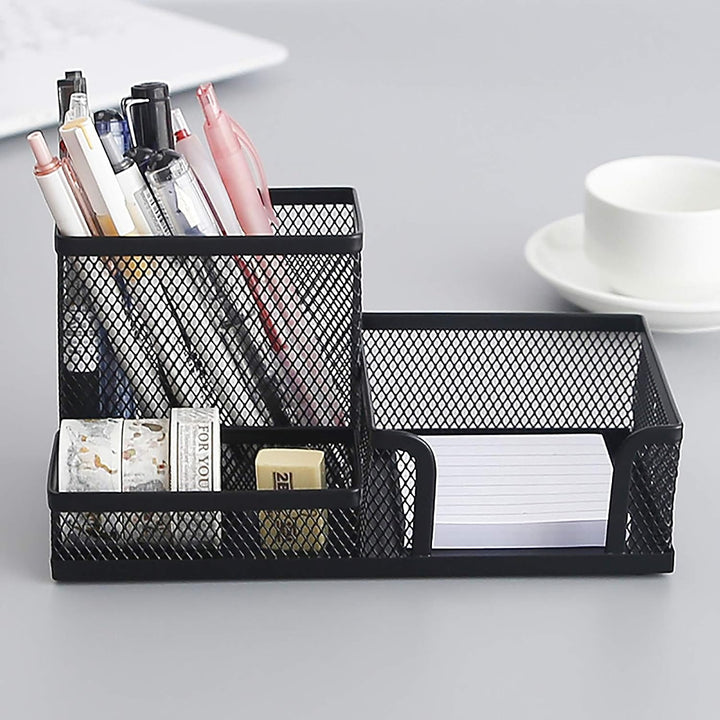- Features 1 pen / pencil holder compartment, 1 supply holder for storing small accessories, 1 supply holder for 3 x 3 inch sticky note pad.