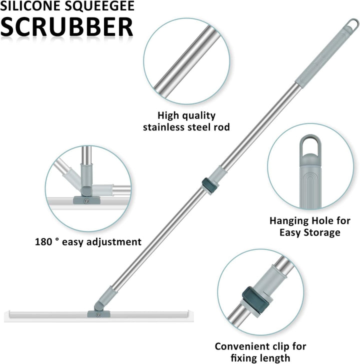 - The silicone squeegee scrubber combined sweeping, scraping, wiping 3 in 1 effects. With a wide 19.7in squeegee head makes cleaning a breeze. Perfect for cleaning water, oil without leaving marks.