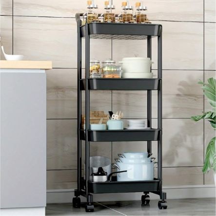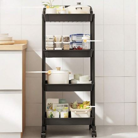 - This Plastic Trolley Cart Organizer shows a sleek, four-tiered plastic trolley cart organizer, featuring a minimalistic black design.