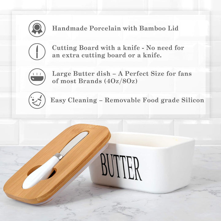 Porcelain Butter Dish with Butter Knife (500ml), Wooden Butter Keeper Container with Knife and Silicone Sealing