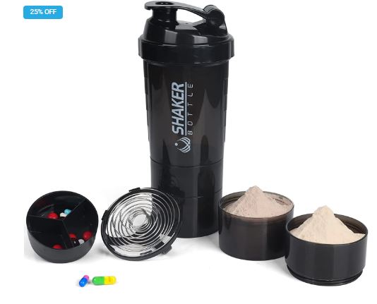 - 2 twist-on cups on bottom of each bottle to store protein powder and capsules, includes capsule organizer.