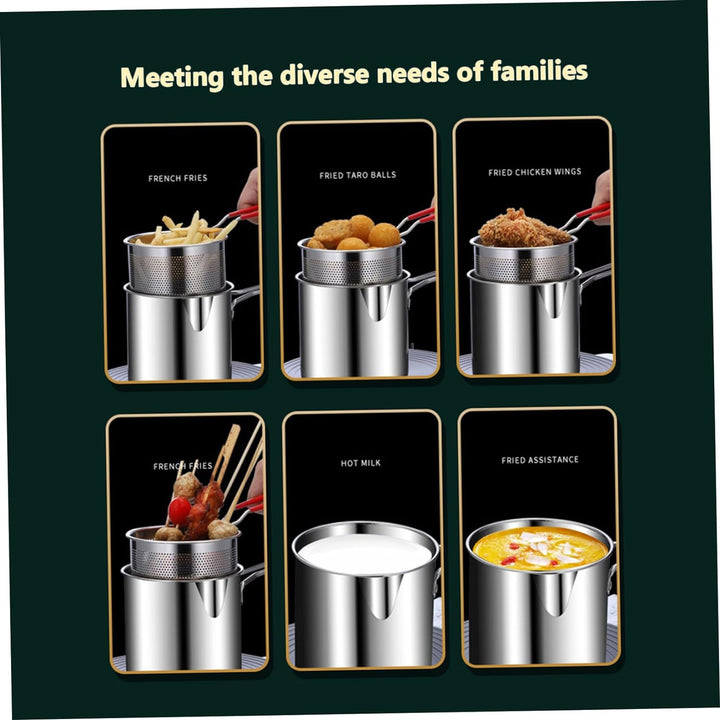 - The frying pot with strainer is ideal for frying French fries, chicken nuggets, squid rings, tempura, shrimp and more.