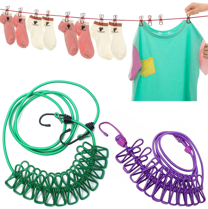 Stretchable Clothes line with 12 Clips Drying Clothesline Hanger Steel Rope